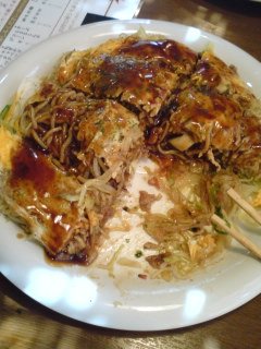 There are two kinds of okonomiyaki, those of the Kansai region (Osaka) and those of Hiroshima. The latter is caracterized by the fact it is served on Japanese noodles, yakisoba 焼きそば. During my stay in Hiroshima, I even tried some served on thick noodles called udon うどん.