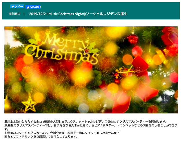 部屋を探す 物件タイプ シェアハウス 全エリアのシェアハウス 東京都のシェアハウス 埼玉県のシェアハウス 神奈川県のシェアハウス 千葉県のシェアハウス 京都府のシェアハウス 大阪府のシェアハウス 兵庫県のシェアハウス 福岡県のシェアハウス 沖縄県のシェアハウス ソーシャルレジデンス 全エリアのソーシャルレジデンス 東京都のソーシャルレジデンス 埼玉県のソーシャルレジデンス 神奈川県のソーシャルレジデンス 千葉県のソーシャルレジデンス 愛知県のソーシャルレジデンス 京都府のソーシャルレジデンス 大阪府のソーシャルレジデンス 兵庫県のソーシャルレジデンス アパート 全エリアのアパート 東京都のアパート 埼玉県のアパート 神奈川県のアパート 千葉県のアパート 愛知県のアパート 京都府のアパート 大阪府のアパート 兵庫県のアパート アパート(家具家電付き) 全エリアのアパート(家具家電付き) 東京都のアパート(家具家電付き) 埼玉県のアパート(家具家電付き) 神奈川県のアパート(家具家電付き) 千葉県のアパート(家具家電付き) 愛知県のアパート(家具家電付き) 京都府のアパート(家具家電付き) 大阪府のアパート(家具家電付き) 兵庫県のアパート(家具家電付き) グランステイ 全エリアのグランステイ 東京都のグランステイ 京都府のグランステイ 大阪府のグランステイ エリア 東京都 埼玉県 神奈川県 千葉県 愛知県 京都府 大阪府 兵庫県 福岡県 沖縄県 入居条件 部屋タイプ 費用 おすすめ 最新空室一覧 新規OPEN キャンペーン 検索方法 地図から探す 沿線・駅から探す 通勤通学時間から探す 閉じる お得なプラン 割引制度 スマート会員 スマート会員制度はオークハウスが提供する入居者向けサービスです。一定の保証金をお預入れ頂く事で家賃が毎月最大1,6万円も割引になる大変お得な会員制度です。 乗り換え割 【他社シェアハウスにお住まいの方限定】家賃割引に使える10,000円分のポイントをプレゼント! 契約プラン FIXプラン 短期間のご利用など、入居時に退去日が確定しているお客様にお得なプランです。FIXプラン利用で1万円ポイントバック!ポイントは現金へ換金可能!よりお得にご利用頂けるプランです。 特典制度 学割 シェアハウスに住んでキャンパスライフを楽しもう!割引でお得に、他の学生とは違ったユニークで刺激的な経験をしよう! アフィリエイト・プログラム 友人やお知り合いにオークハウスを紹介して報酬を獲得しよう!ブログやSNS等のメディアを使っての紹介も大歓迎です! 閉じる イベント 利用者の声 インタビュー 入居者インタビュー 法人インタビュー オーナーインタビュー ブログ ブログ一覧 住まいガイド シェアハウスとは? シェアハウスの選び方 シェアハウスQ&A ルームシェアについて ゲストハウスについて オークアパートメントとは? オークアパートメントQ&A ソーシャルレジデンス®とは? ソーシャルレジデンス®Q&A グランステイとは? グランステイQ&A 特集 http://www.oakhouse.jp/column 外国人と暮らす国際交流シェアハウス 日本人と交流できるシェアハウス シェアハウスで出会う。 ワーキングホリデー 閉じる 法人向けサービス オーナー様 オークハウスについて 会社概要 会社概要 会社案内 メディア掲載情報 個人情報保護方針 サービス紹介 オークハウスポータルについて 宣言 本当に使える部屋探し オークハウス公式アプリ コミュニティ オークフェローズとは 公式SNS Facebook Instagram YouTube Twitter 閉じる 採用情報 サポート Select Language: Japanese English Chinese French Korean MENU サポート Lang Japanese English Chinese French Korean マイページ カート オークハウス ソーシャルレジデンス一覧 東京都 吉祥寺・立川・小金井・町田エリア 福生市 ソーシャルレジデンス福生 レジデントブログ MusicChristmasNight MusicChristmasNight ← 前へ 次へ → コメントを残す コメントをキャンセルメールアドレスが公開されることはありません。 * が付いている欄は必須項目ですコメント 名前 * メール * サイト 次回のコメントで使用するためブラウザーに自分の名前、メールアドレス、サイトを保存する。