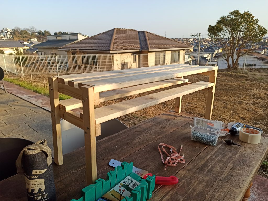 養生テープなどで抑えながらビスを打ち込んでいき、組み立て完了。二度目なこともありちょっと慣れてきて、ちょっとスピードアップもしました。