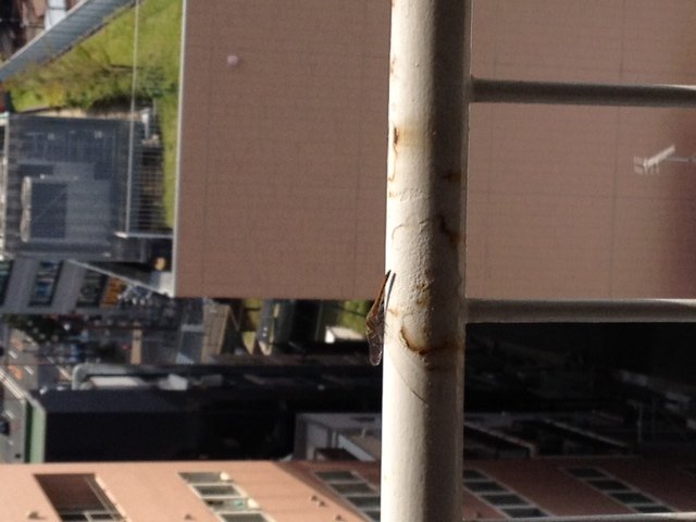 ベランダ?から外を眺めていたら手すりにトンボが止まってた。