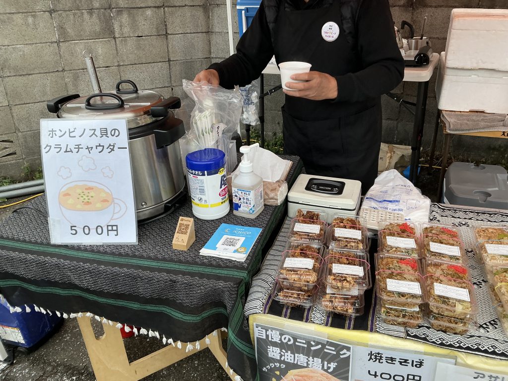 ホンビノス貝のクラムチャウダーとアサリめしいただく。