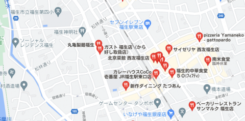 SR福生(画面左端)だと、丸亀製麺やガストが徒歩7分くらいにある。