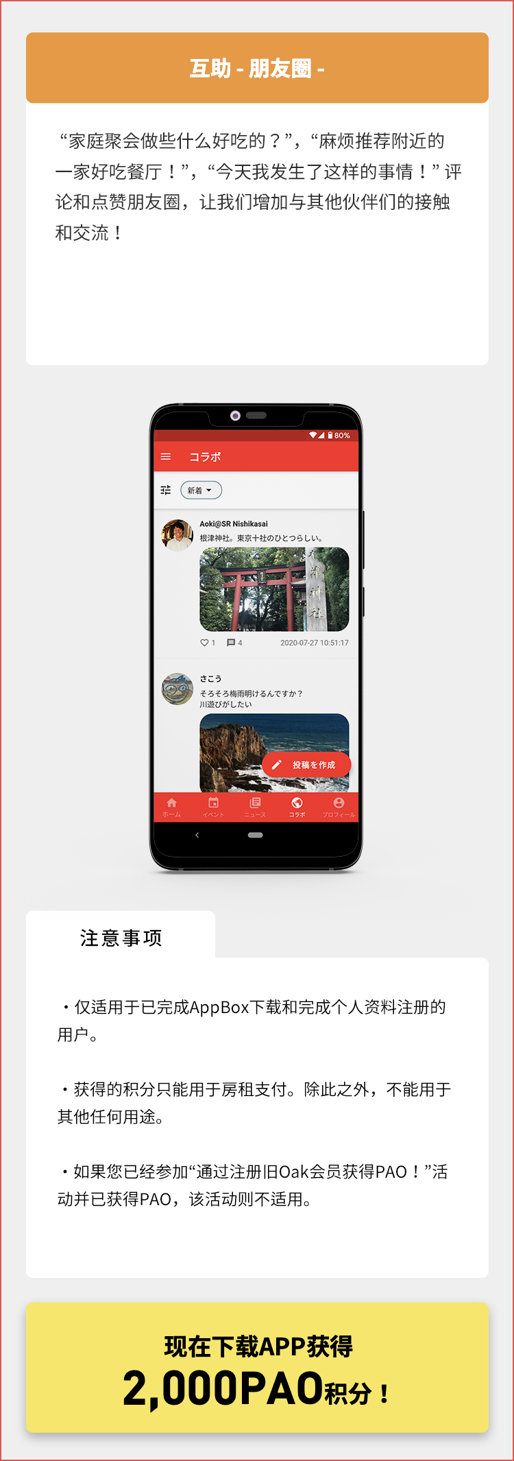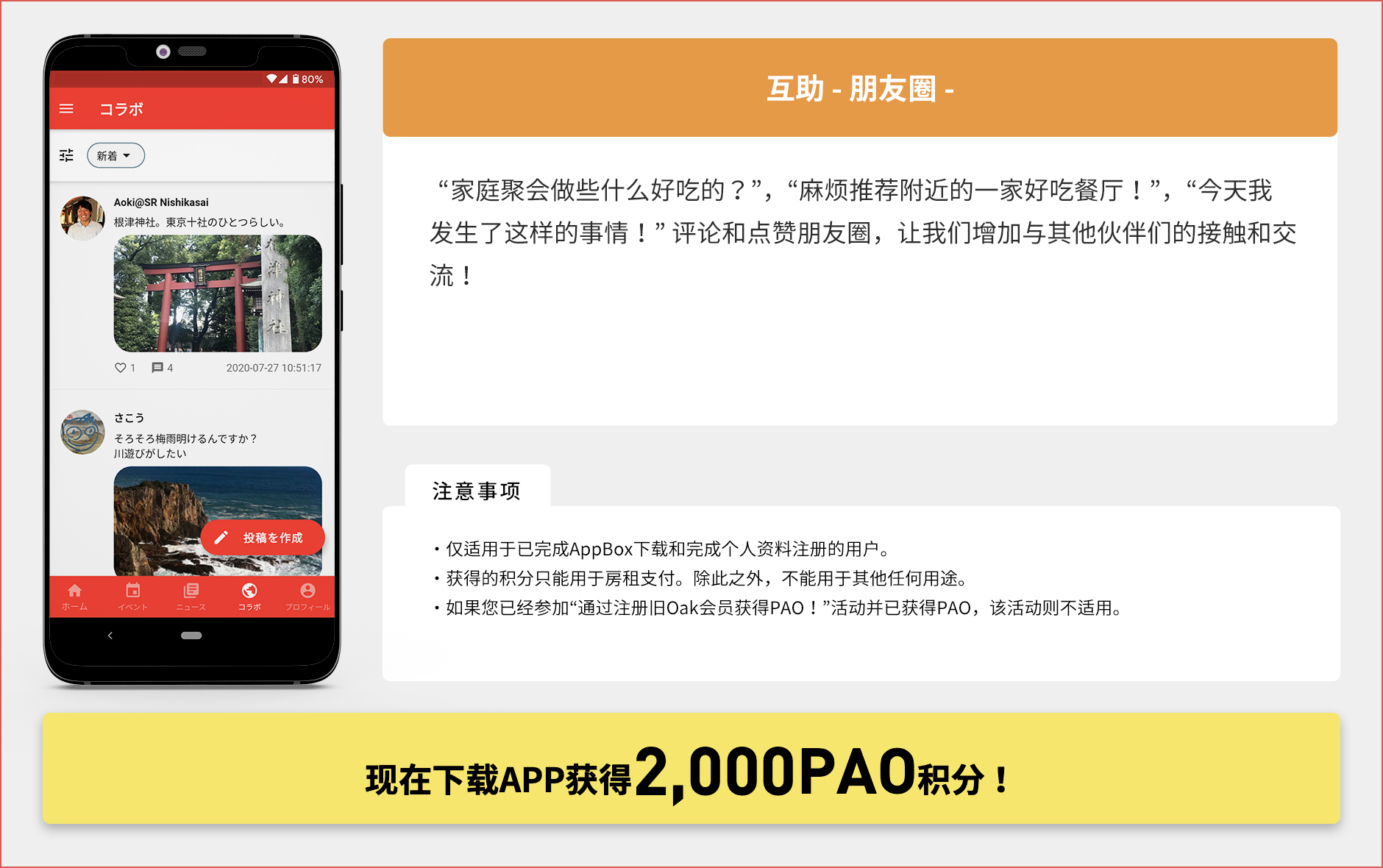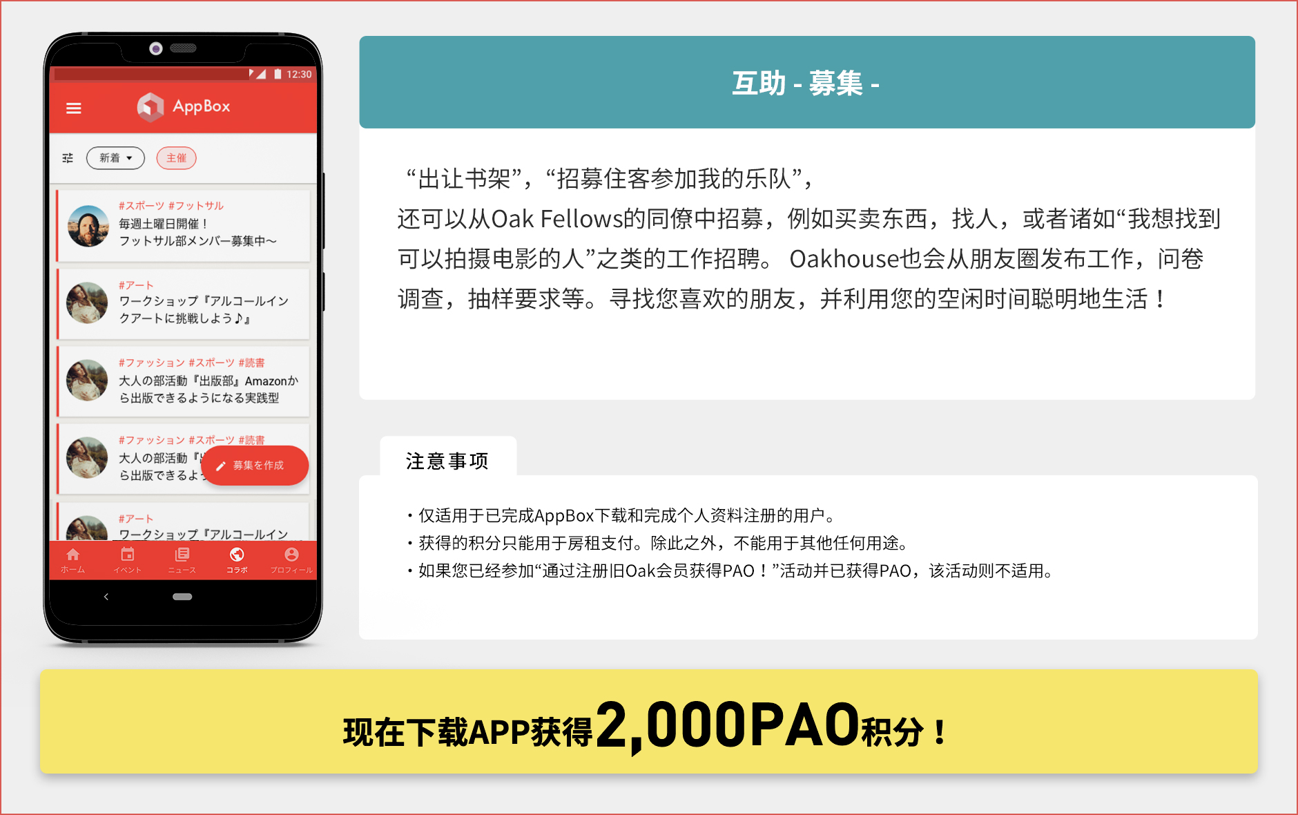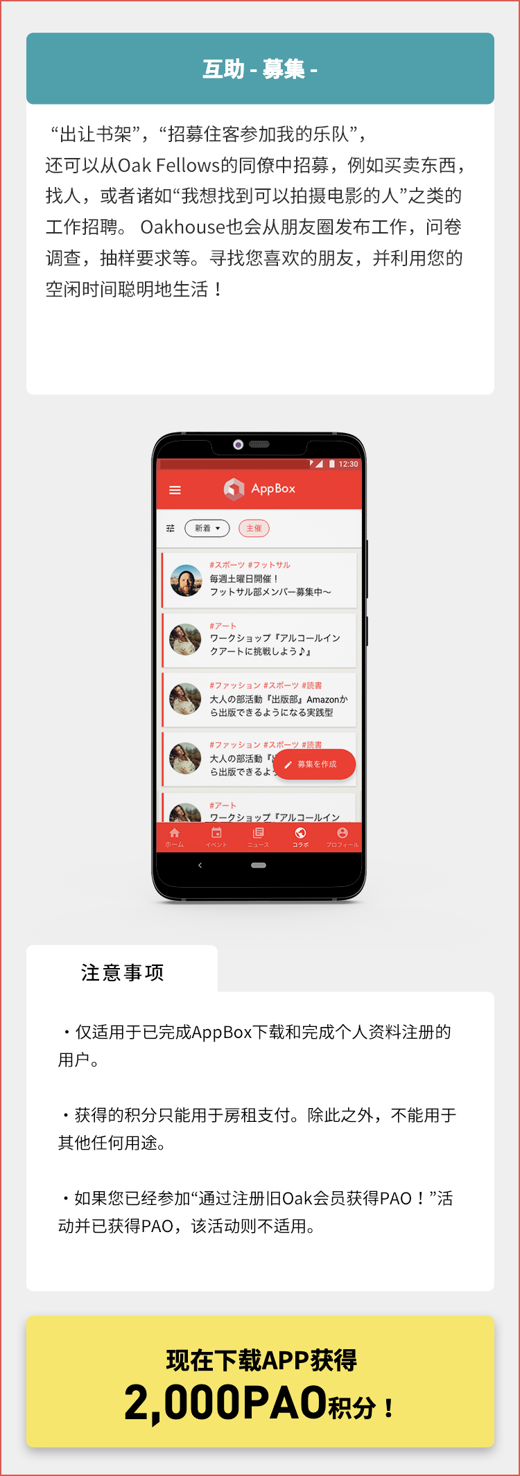 Oakhouse官方应用程序 ー 即使您不同时居住在同一处房产,您也可以在Oakhouse官方应用程序上发布您的个人资料,并通过共同的兴趣爱好找到新的联系人。您可以计划旅行并邀请他人加入,寻找可以互相教授英语和日语的人,提供或接受生活建议,以及与其他人自由合作。您还可以使用Oakhouse官方应用程序的时间轴,享受每天的小型交流活动。官方应用程序 - 即使您不同时居住在同一处房产,您也可以在 Oakhouse官方应用程序上发布您的个人资料,并通过共同的兴趣爱好找到新的联系人。您可以计划旅行并邀请他人加入,寻找可以互相教授英语和日语的人,提供或接受生活建议,以及与其他人自由合作。您还可以使用Oakhouse官方应用程序的时间轴,享受每天的小型交流活动。