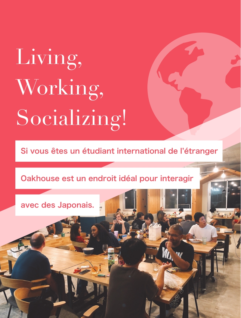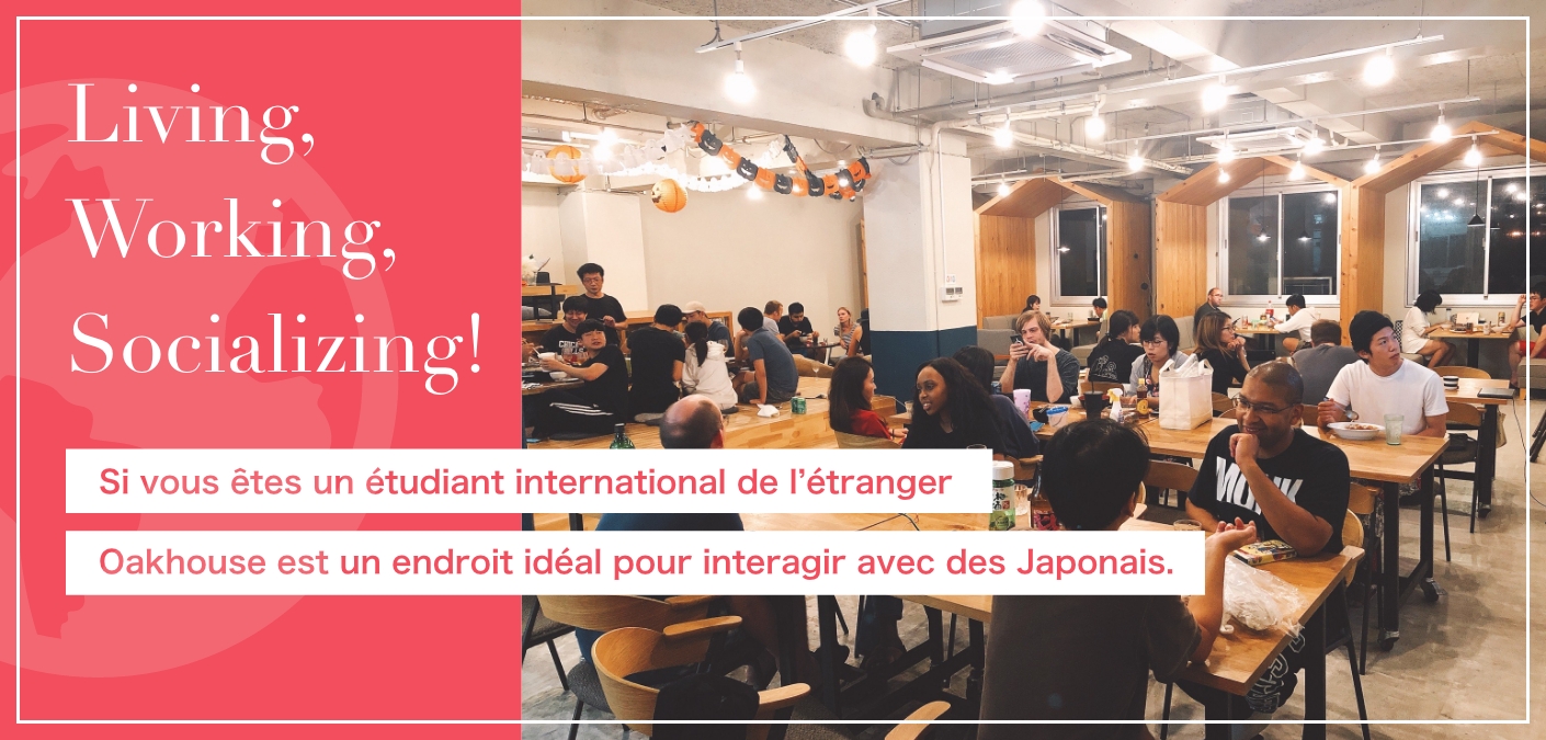 Ses logements entièrement meublés avec une connexion Internet déjà disponible vous permettent de commencer votre vie au Japon tout de suite. En outre, Oakhouse accueillent des personnes originaires de plus de 100 pays différents, et les résidents sont très actifs dans leurs interactions les uns avec les autres, ce qui facilite les rencontres. Il y a également beaucoup de résidents japonais, ce qui est parfait pour apprendre la langue et découvrir la culture japonaise.