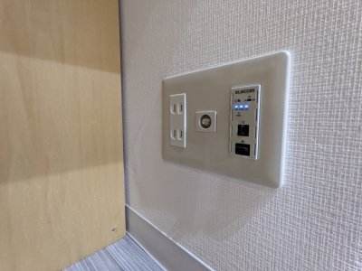 机の下に電源と居室専用Wi-Fiがあります。