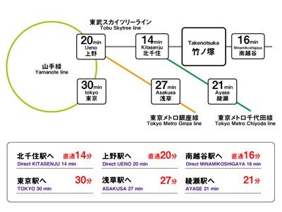 도쿄도 아다치구는, 키타센쥬지역등 상업시설이 발달한 지역도 있지만, 대다수는 맨션과 단독주택 등의 조용한 거주지 입니다. 주택가는 역 주변을 중심으로 슈퍼마켓, 상점가들이 위치, 서민적인 정취를 느낄 수 있습니다. 최근에는 아다치구내의 교통기관의 발달과 공원녹지의 정비 등으로 거주지로서 인기가 높아지고 있습니다.