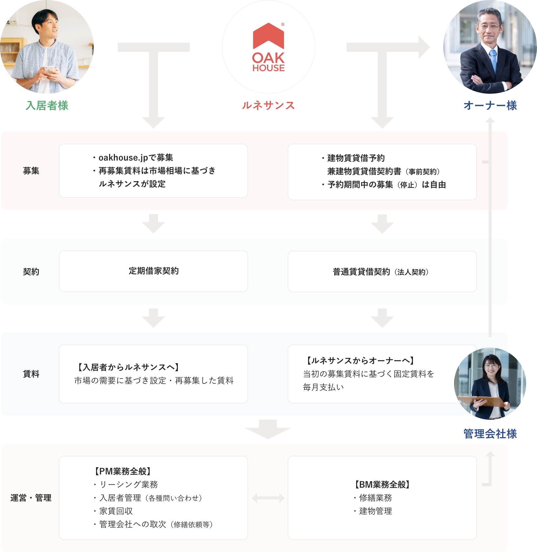 ルネサンスと入居者との定期借家契約締結と同時に、ルネサンスとオーナー間の賃貸借契約を締結し、借上げを開始します。