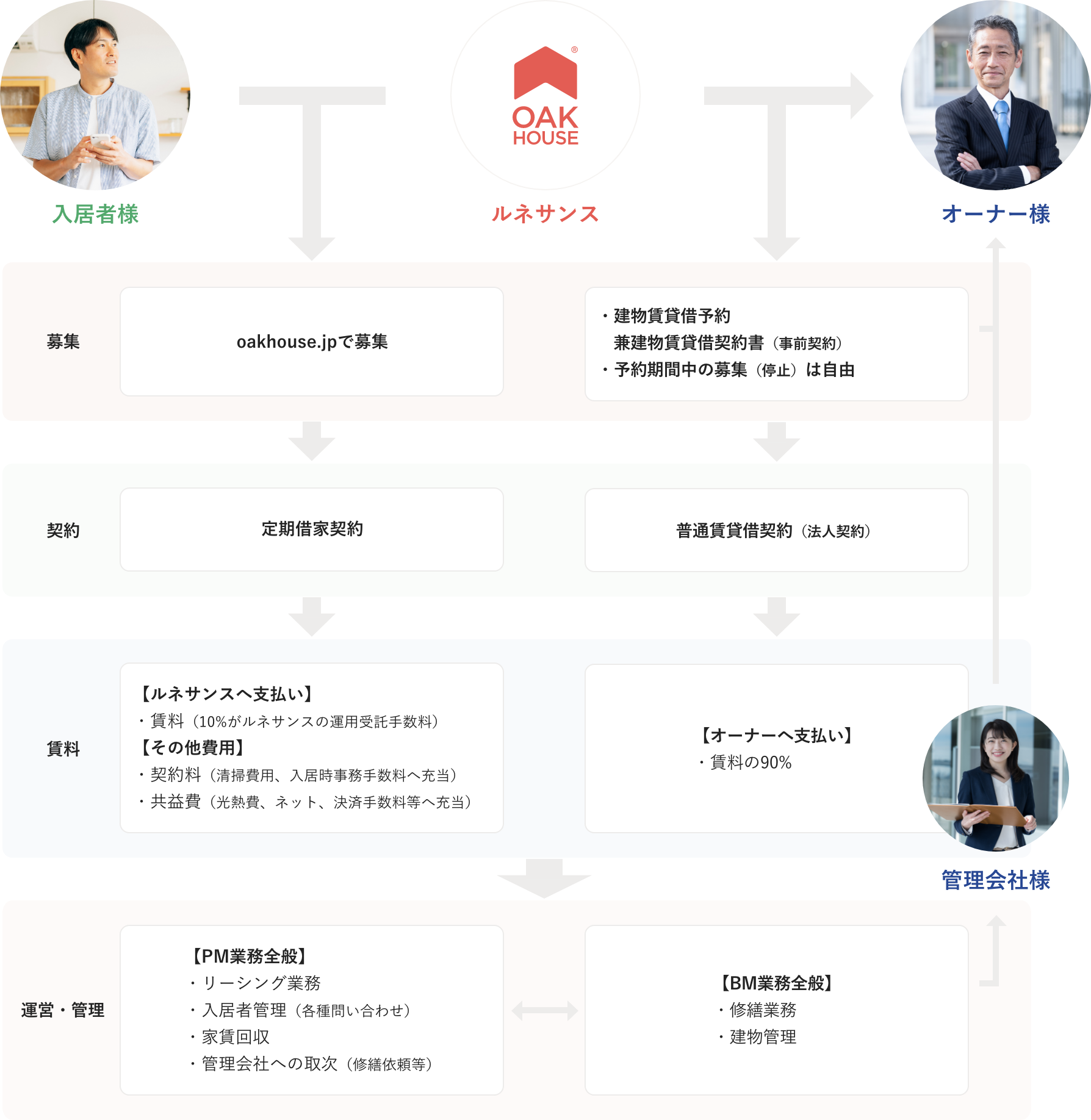 入居者対応および室内運用は当社が行い、建物管理は従来通り管理会社が行います。 -