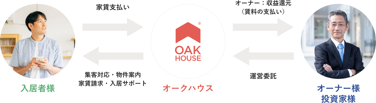 オークハウスがオーナー様に代わり物件を一括借上げし、運営管理、入居対応を行う仕組みです。
